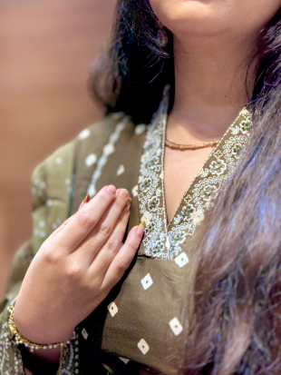 A graceful olive-green ethnic set featuring delicate traditional motifs and a finely detailed neckline. Paired with matching pants and a soft dupatta, this outfit blends timeless elegance with everyday comfort—perfect for festive gatherings or refined casual wear.