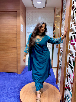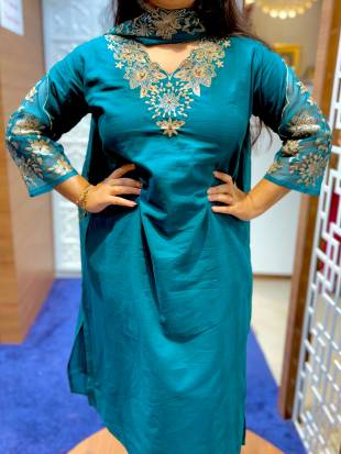 A graceful woman dressed in a deep teal traditional outfit highlighted with intricate gold embroidery. The flowing dupatta and elegant detailing create a sophisticated, festive look with effortless charm.